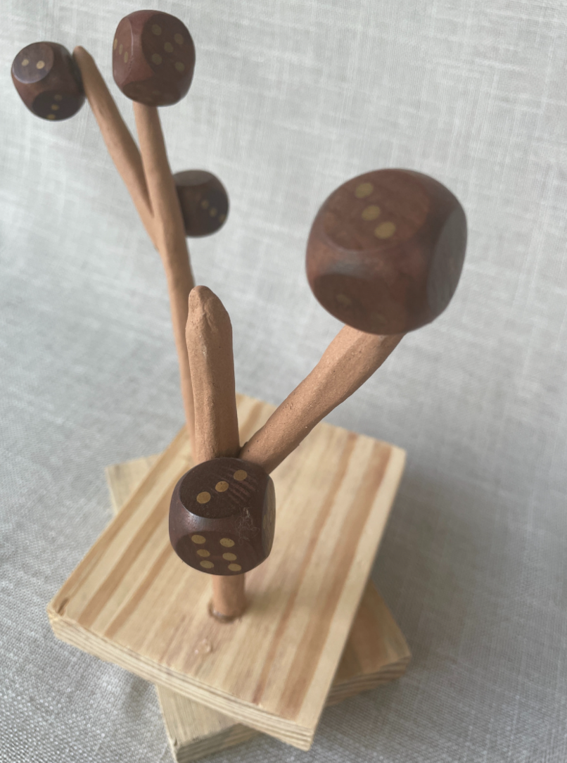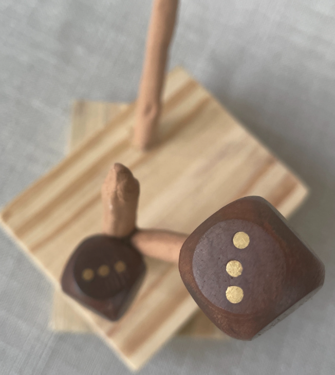 Madeira, cerâmica e dados antigos 30 x 27 x 15cm