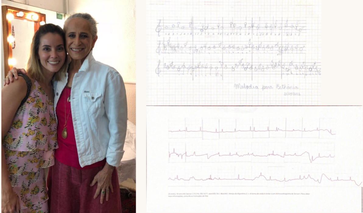 Composição musical e dossiê de processo 23 x 33,5 x 3cm Este trabalho versa sobre um diário de batimentos cardíacos, medidos e compilados através do app de eletrocardiogramas do apple watch. Em março de 2018 a artista abraçou Maria Bethânia após o show de gravação de seu DVD ao vivo na cidade do Rio de Janeiro. A emoção do momento foi tamanha, que desde então seu coração acelerou, adquirindo assim uma arritmia cardíaca benigna. Esse descompasso dos batimentos foi medido e registrado por 30 dias. Fragmentos dos eletrocardiogramas foram recortados e remontados na construção de um ECG construído com as variações de pico dos batimentos, posteriormente sobre posto a uma pauta musical. Para cada pico foi atribuída uma nota, de acordo com o seu posicionamento na pauta, resultando assim na Melodia para Bethânia. O corpo da artista revive diariamente a emoção daquele abraço e esta é uma homenagem àquela, cuja voz além de emocionar, faz disparar os corações.